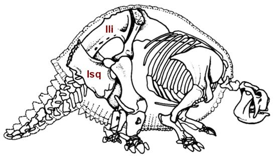 En los verdaderos Armadillos, existe un número variable de bandas transversales móviles, poseen un hueso sacro largo y grueso que sostiene el caparazón en tanto que bajo la armadura escapular existen vértebras cervicales fusionadas.